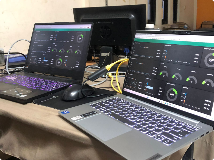 Additionally, the system incorporated a status indicator to show whether the UPS units were on or off. Communication between the monitoring system and the UPS units was established using the Modbus TCP/IP protocol, ensuring reliable and real-time data transmission. The goal of this project was to create a user-friendly and interactive monitoring solution for real-time tracking of the UPS units' performance and operational status.